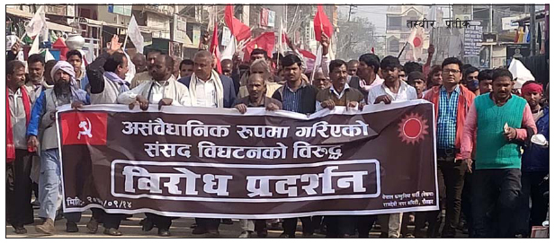 नेकपा (प्रचण्ड–नेपाल) समूहले संसद् विघटनको विरोधमा मङ्गलवार ७७ जिल्लामा प्रदर्शन घोषणा गरेअनुरूप वीरगंजको घण्टाघरमा सो समूहले प्रदर्शन तथा कोणसभा गरेको छ।