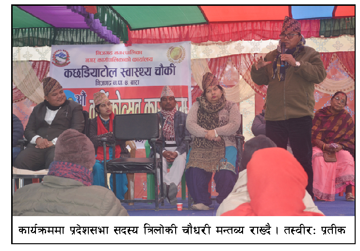 प्रमुख अतिथि प्रदेशसभा सदस्य त्रिलोकी चौधरी र निजगढ नगरपालिकाकी उपप्रमुख लीलादेवी लामिछानेले संयुक्तरूपमा कार्यक्रमको उद्घाटन गरेका थिए। सो अवसरमा प्रदेशसभा सदस्य चौधरीले स्वास्थ्य चौकी स्वर्ण वर्षमा प्रवेश गरे पनि यसको भौतिक संरचना भने दिनानुदिन जीण्र्F हँुदै गइरहेको भन्दै स्थानीय तहका जनप्रतिनिधिहरूको ध्यानाकर्षण गराए। उनले आपूm सो क्षेत्रका प्रदेश सांसदको हैसियतले स्थानीय तह साथै केन्द्र सरकारसँग समेत साझेदारी गरेर स्वास्थ्य चौकी भवन निर्माण र आधुनिकीकरणका लागि तयार रहेको प्रतिबद्धता जाहेर गरे।